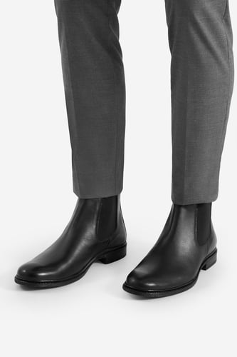 - La birou: ghete elegante din piele neagră cu costum slim-fit.